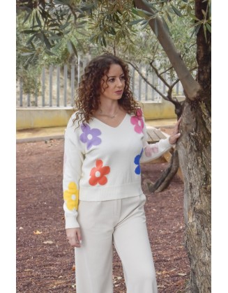 Conjunto compuesto por un top largo cruzado de mangas tres cuartas largas y pantalón de corte recto